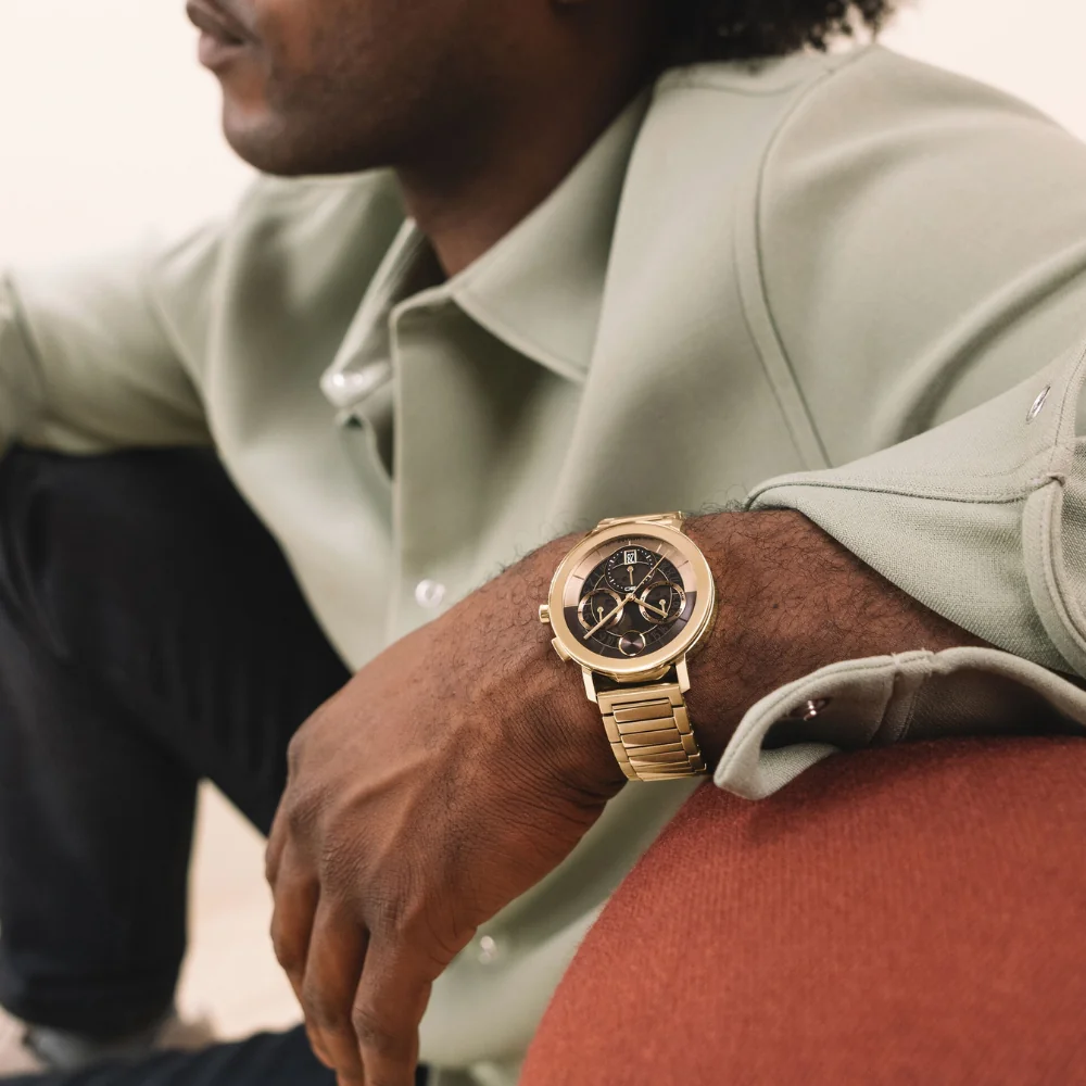This 42mm chronograph watch features a transparent coffee brown dial with yellow gold tone subdials, slim hands, and our signature dot at 12 o’clock.
