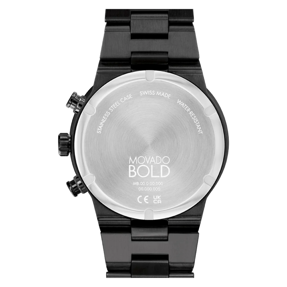 BOLD Fusion Chronograph, 44mm black ion-plated stainless steel case and bracelet with a black and pale yellow gold accented chronograph dial, ceramic bezel, and date window detailing.