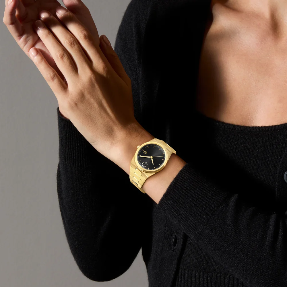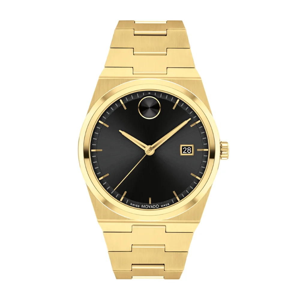 This 40mm watch features a black sunray dial, yellow goldtone hands, and our signature dot at 12 o’clock.