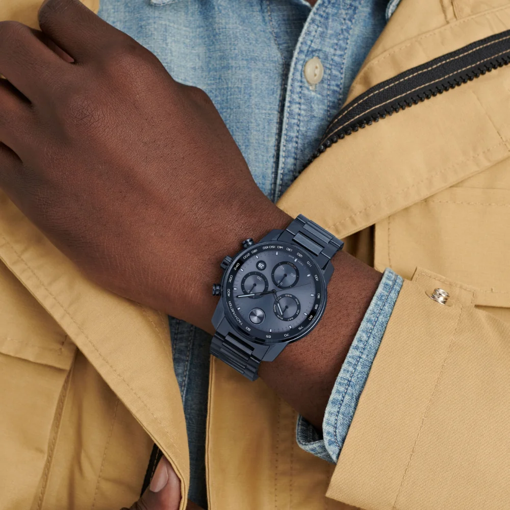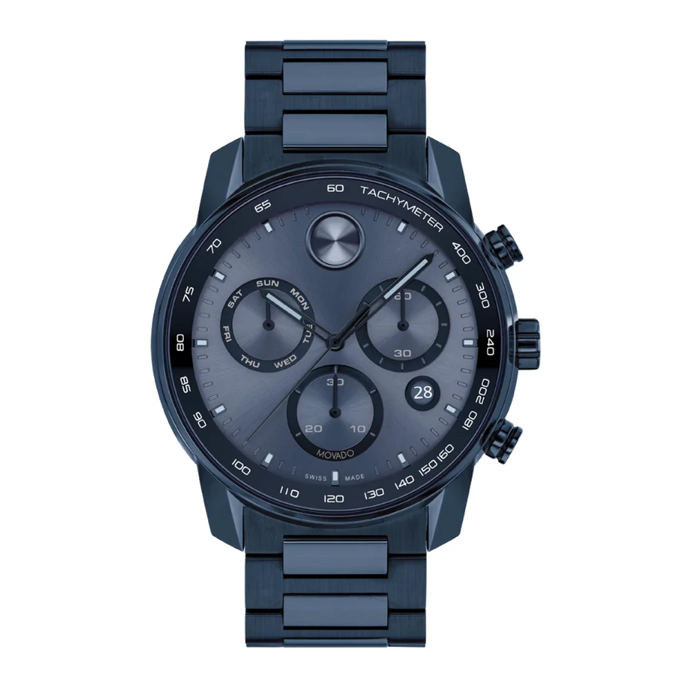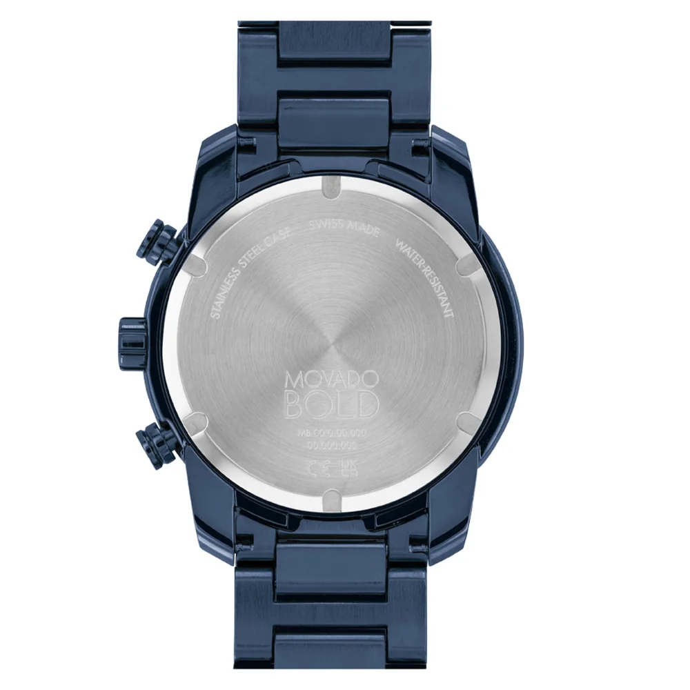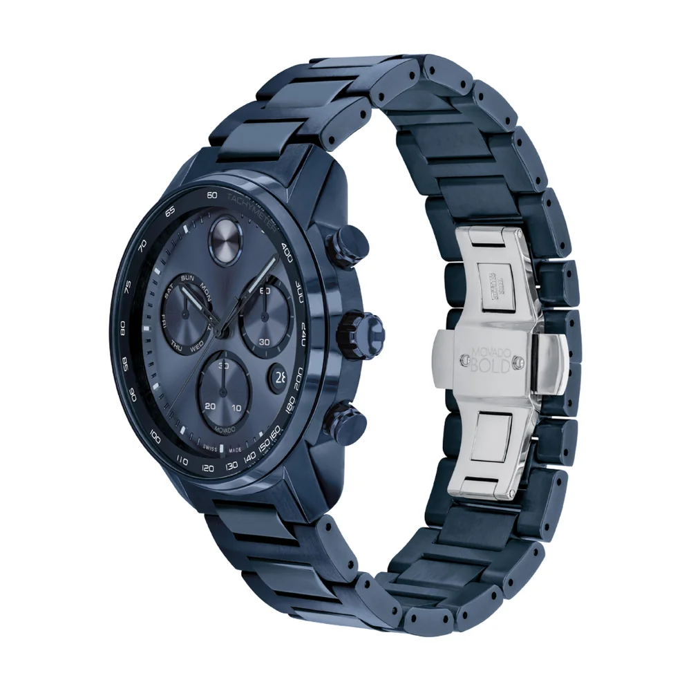BOLD Verso Chronograph, 44mm blue ion-plated stainless steel case and bracelet with tachymeter scale. Features a blue chronograph dial & Swiss Super-LumiNova® accents and date window detailing.