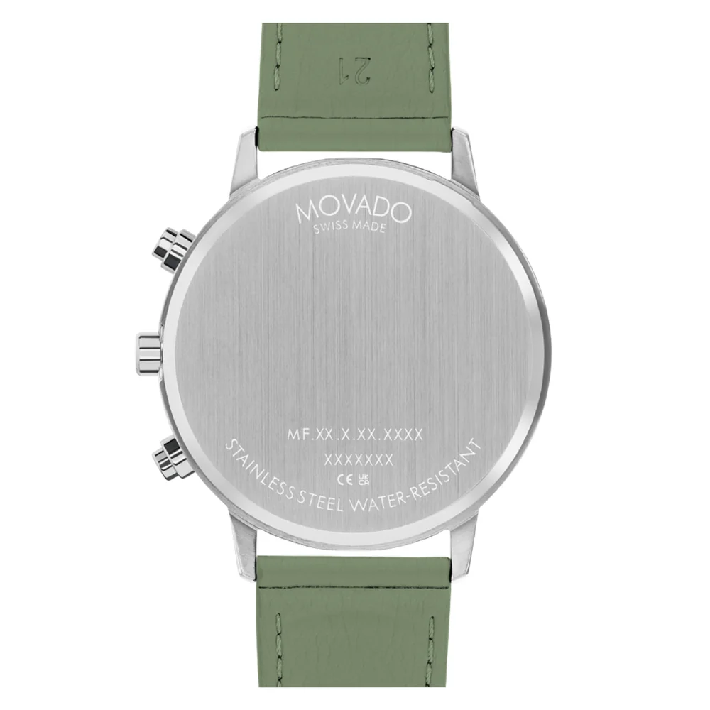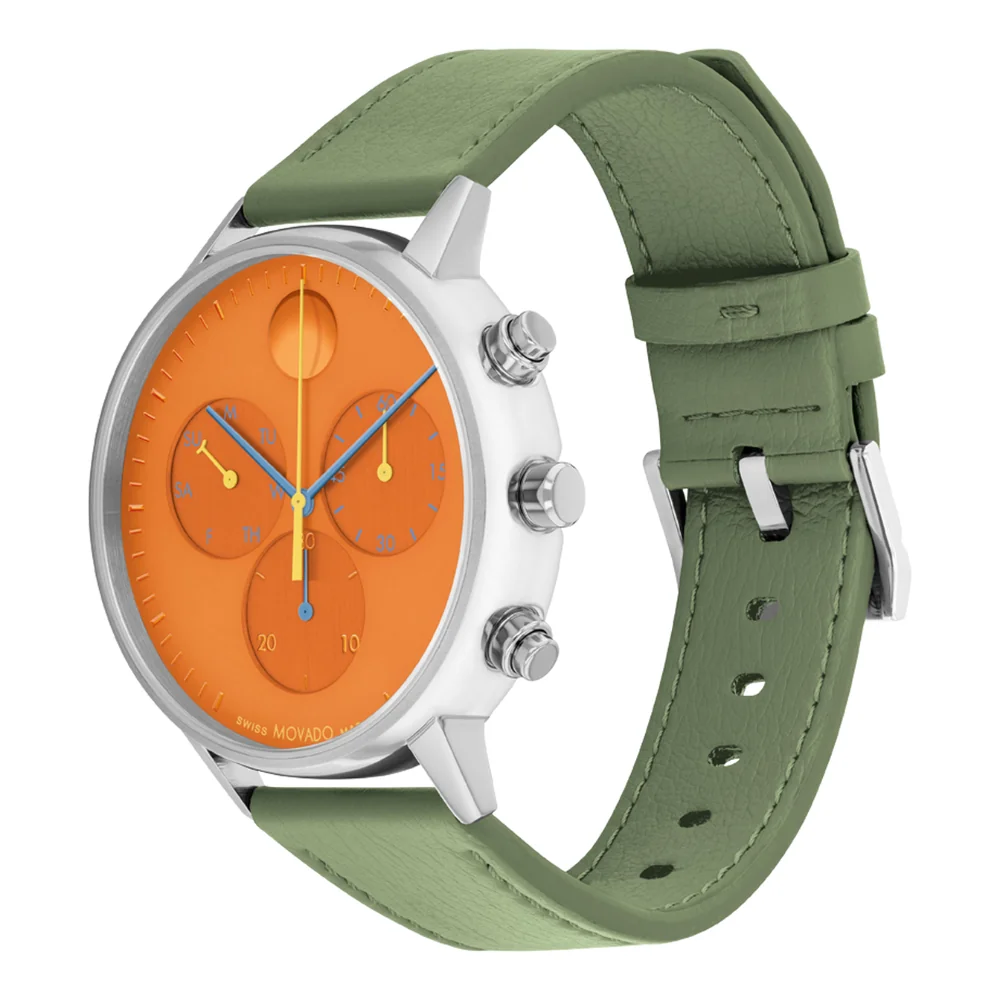 A fresh, fun take on ultra-modern, hyper-minimalist design. Add a pop of color to any look with this vibrant Face chronograph. Its 43mm ion-plated stainless steel case houses a bright orange dial with blue and yellow accents, slim hands, three subdials and a recessed dot at 12 o’clock. We’ve paired it with an olive green strap crafted from vegan leather with a buckle closure.