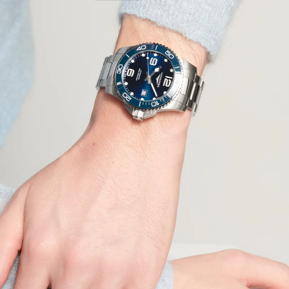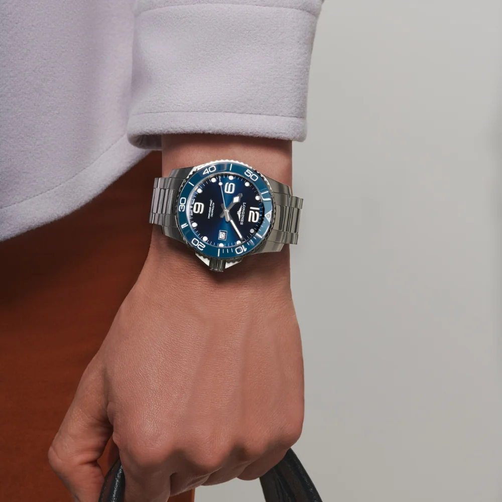 Inspired by the world of water sports, the HydroConquest collection stands out with its daring design. Water-resistant up to 30 bar (300 m) with a unidirectional rotating bezel and screw-down crown and case back, it guarantees exceptional reliability at all times.