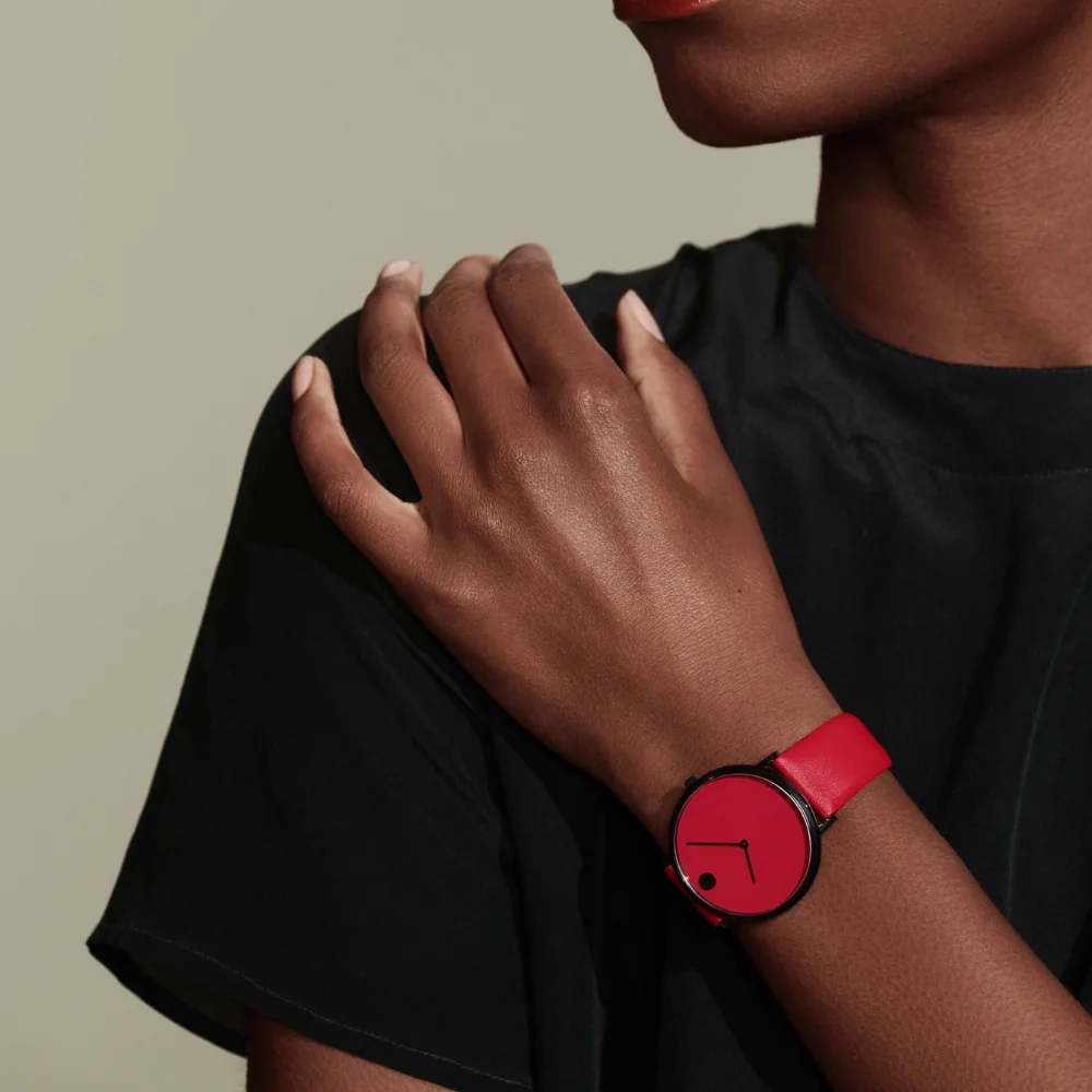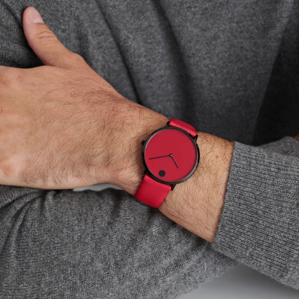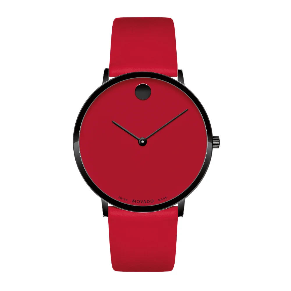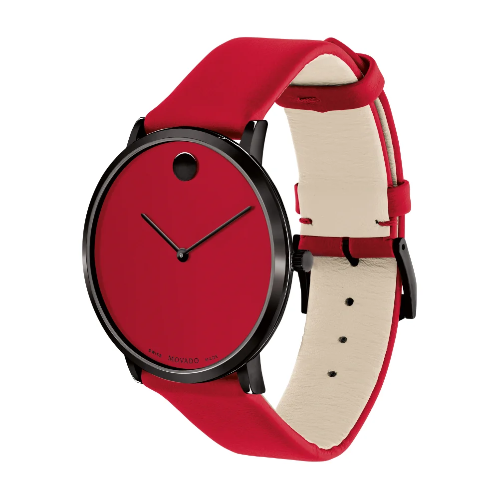 Movado.com EXCLUSIVE Modern 47, 40 mm black PVD-finished stainless steel case with red-toned dial on red leather strap.