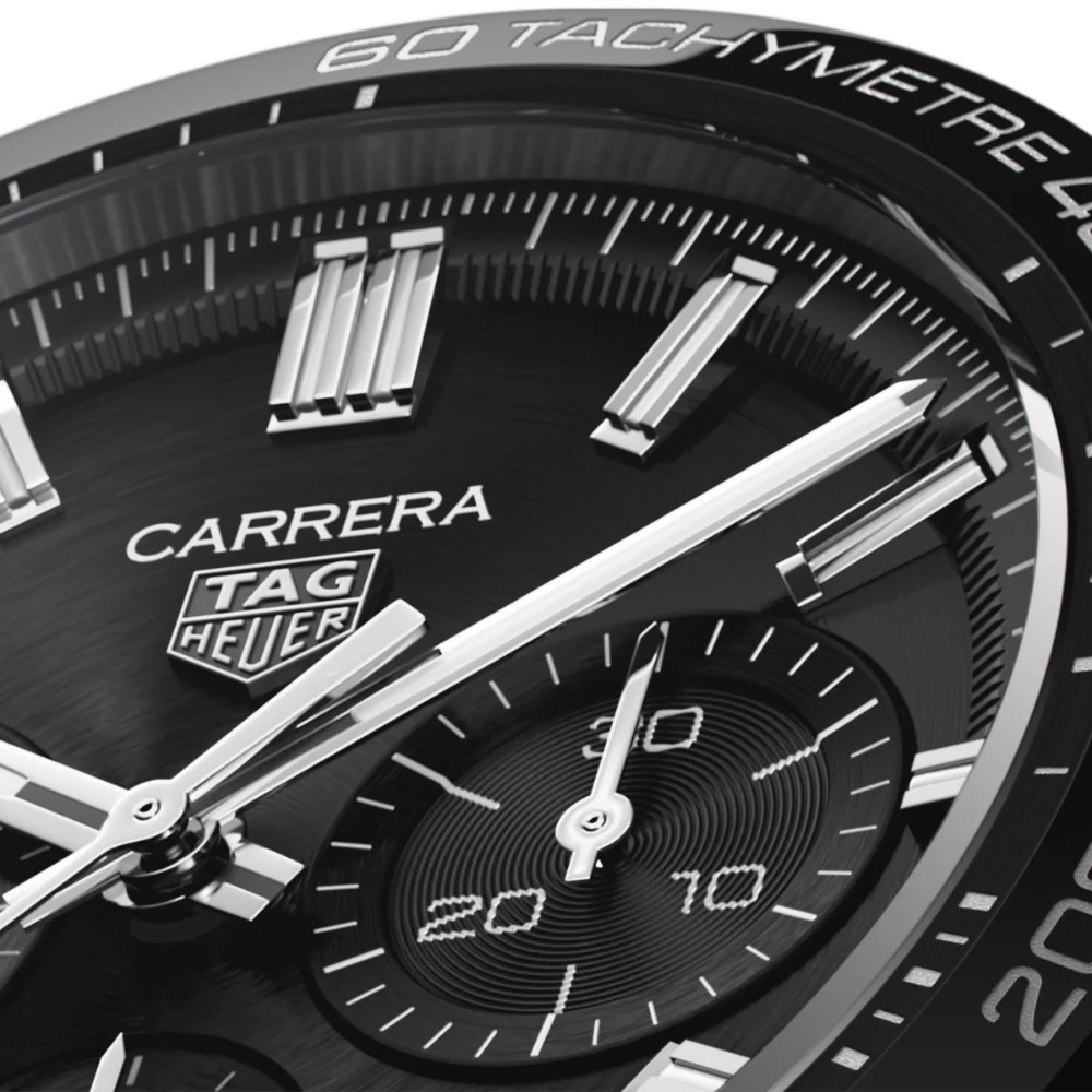 The chronograph to be reckoned with, this 44 mm TAG Heuer Carrera is as smolderingly serious as it gets. The black dial, with black counters, is sporty and elegant, a design that never skips on style. Inside beats our manufacture Heuer 02 automatic movement, with a 80-hour power reserve.The model’s wrist measures 16 cm and he is wearing a watch with a 44 mm dial.