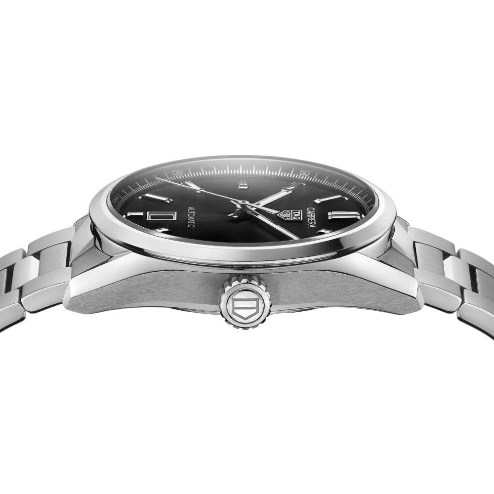 The iconic TAG Heuer Carrera in its most elegant form. A distillation of the famous model to its most ambitious refinement. The finely brushed steel case, and dramatically finished black dial gives this signature design an emblematic, urban look.