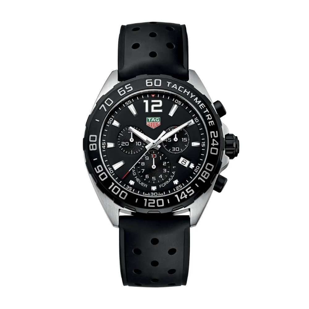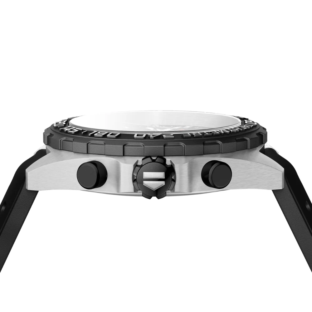 A high-precision quartz racing chronograph with an all-black dial and 200-meter water resistance. Inspired by motor-racing, this robust model is built for speed, endurance and audacity.The model’s wrist measures 19 cm and he is wearing a watch with a 43 mm dial.