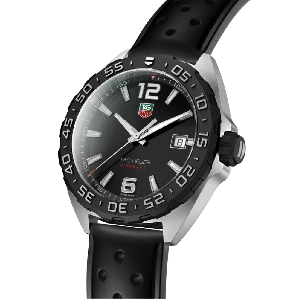 A men’s sports watch with black dial in a brushed steel case. The 41mm case is brushed stainless steel matched with a steel black PVD unidirectional turning bezel and screw-down crown. The look is sporty, urban and fearless.
