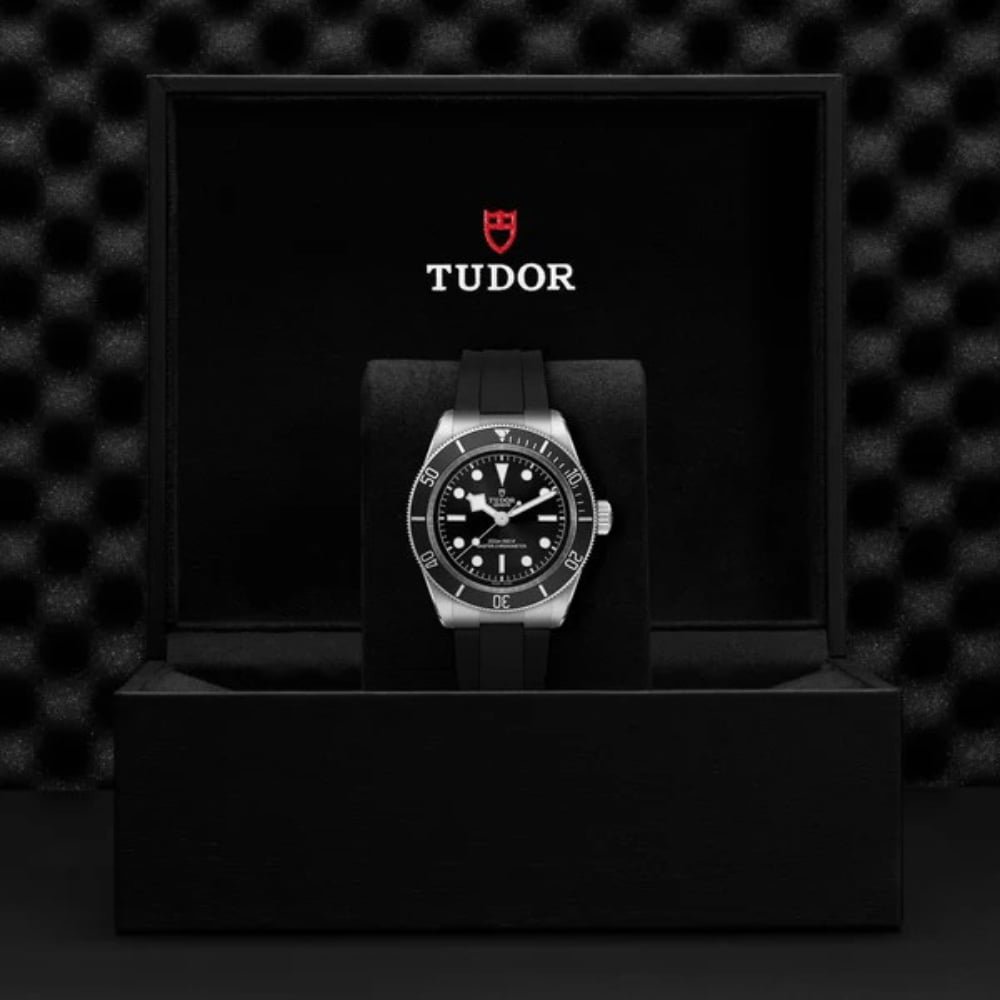 41mm stainless steel case with polished and satin finish and rubber strap with TUDOR “T-fit” clasp. 60-minute unidirectional bezel in stainless steel with aluminium insert. Manufacture Calibre MT5602-U, self-winding mechanical movement with bidirectional rotor system. Black domed dial. Stainless steel screw-down crown with the TUDOR rose in relief. Domed sapphire crystal and waterproof to 200m (660 ft).