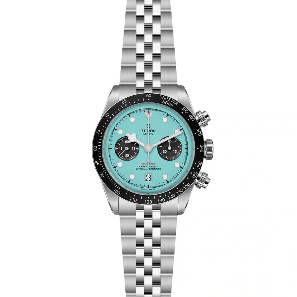 Highly sought after, Tudor Black Bay Chrono with stainless steel case. Rare Flamingo dial and black aluminum bezel. Supported by a 5-link steel bracelet with folding clasp and safety catch.