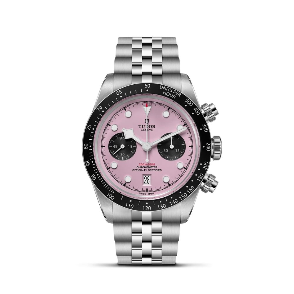 Highly sought after, Tudor Black Bay Chrono with stainless steel case. Pink dial and black aluminum bezel. Supported by a 5-link steel bracelet with folding clasp and safety catch.
