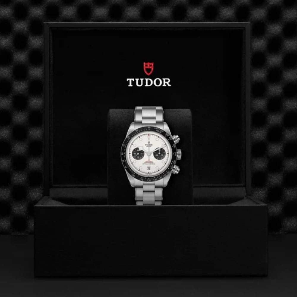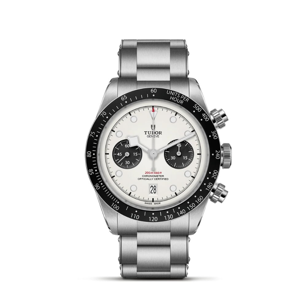 41 mm stainless steel case with polished and satin-brushed finishes. Fixed stainless steel bezel with matt black anodised aluminum disc with tachymetric scale and silver markings and 3-link stainless steel “rivet-style” bracelet with polished and satin-brushed finishes, with TUDOR “T-fit” rapid adjustment clasp. Manufacture Calibre MT5813 with chronograph function and self-winding mechanical chronograph movement with bidirectional rotor system. Opaline dial with black counters, domed date at 6′ o’clock. Stainless steel screw-down winding crown with the TUDOR rose in relief and stainless steel screw-down pushers at 2 o’clock and 4 o’clock. Domed sapphire crystal. Waterproof to 200 m (660 ft).
