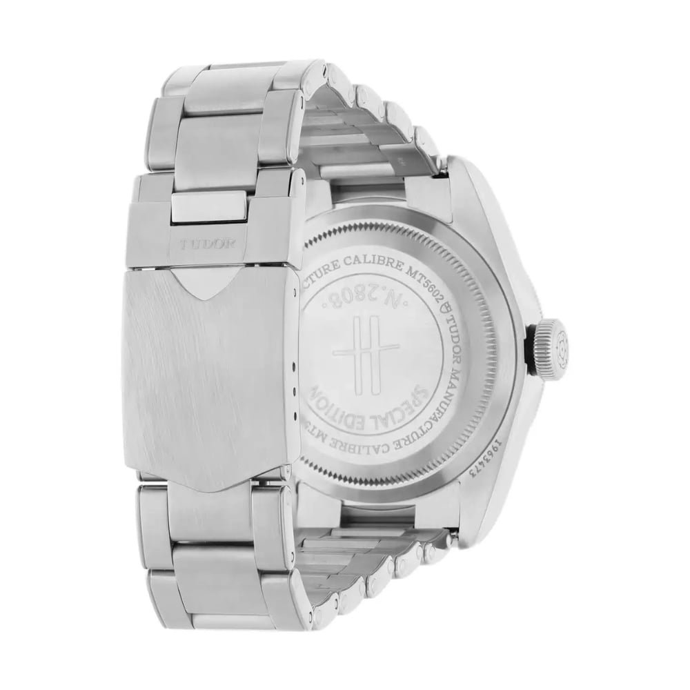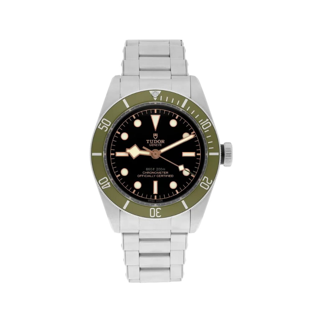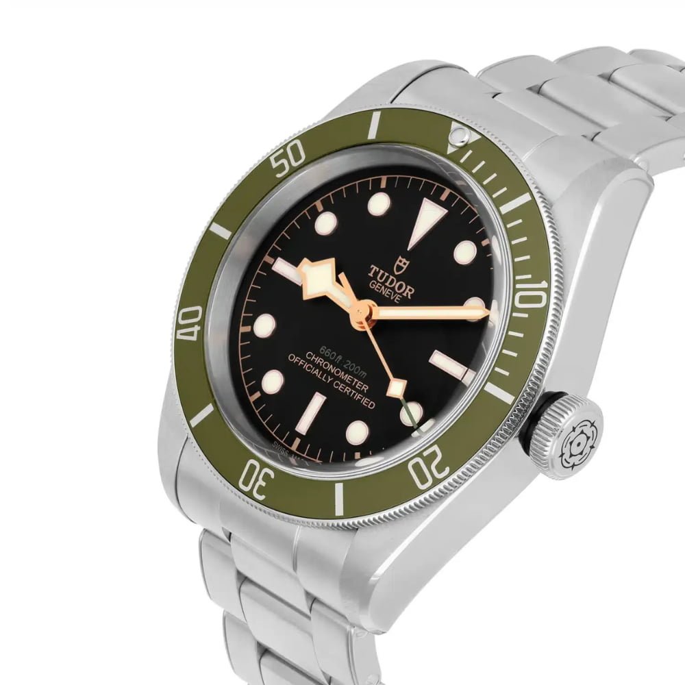 This Tudor Black Bay 79230G “Harrods” men’s automatic dive watch is a stylish and functional timepiece. The watch features a green unidirectional rotating bezel, black dial with arrow markers, baton indexes, and round indexes. The watch comes with a silver stainless steel bracelet and has a 41mm case size. It has a mechanical (automatic) movement and is water-resistant up to 200 m (20 ATM). The watch also has luminous hands, a screwdown crown, sapphire crystal, and is scratch-resistant. It comes with the original box and papers. This watch is perfect for anyone who wants a luxury, sporty, or casual timepiece.